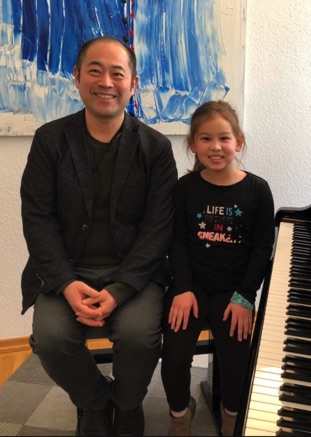 Die zehnjährige Muna Thorwesten mit dem Stück "Dr. Faust' s Jux mit schwarzen Tasten", das sie mit Klavierlehrer Herrn Ryuji Hino vierhändig vortrug.