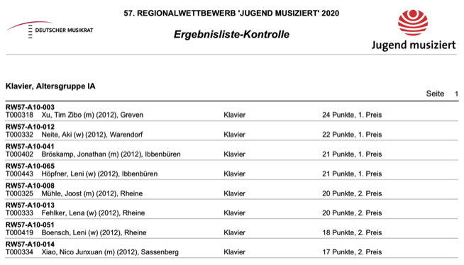 Die Warendorfer Klavierschülerin Aki Neite erreichte am Samstag mit 22 Punkten beim 57. Regionalwettbewerb von JUGEND MUSIZIERT in Münster den 1. Preis in der Kategorie Klavier, Gruppe IA. Die 8-Jährige Schülerin von Musiklehrer Ryuji Hino an der Musikschule Pianokolleg Borbe in Warendorf brillierte mit fünf Stücken: 1. Johann Sebastian Bach (1685-1750), Menuett G-Dur BWV Anh. 114 Moderato; 2. Georg Philipp Telemann (1681-1767), Danse Galante, e-Moll; 3. Friedrich Burgmüller (1806-1874); 4. La Chevaleresque C-Dur op. 100 Allegro marziale, 5. Robert Schumann (1810-1856) Wilder Reiter, a-Moll, op. 68. Leiter des Pianokollegs Harald C. Borbe: „Wir freuen uns sehr, dass Aki diesen ersten Preis direkt beim ersten Mal an der Teilnahme eines solchen Wettbewerbs gewonnen hat und gratulieren Aki und ihrem Lehrer Herrn Ryuji Hino ganz herzlich zu dieser herausragenden Leistung.“
